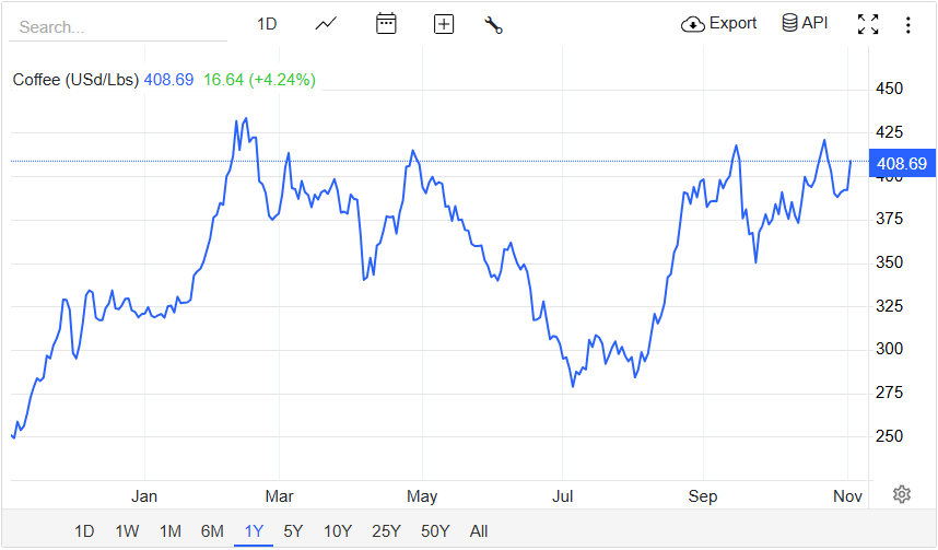 Arabica coffee futures surged to around $4 per pound, the highest since October 24, pressured by the continued decline in certified coffee inventories, further exacerbated by US 50% tariffs on Brazilian coffee. US roasters are still avoiding major contracts with Brazil, as they await developments in US-Brazil trade negotiations. ICE-monitored arabica inventories fell to a 19.5-month low of 431,728 bags as of October 31. Meanwhile, traders remained focused on weather conditions in top producer Brazil. The country's coffee-producing regions experienced irregular and scarce rainfall during the last flowering cycle in October, raising concerns about flowering and fruit set for the 2026 crop. Brazil’s 2025/26 coffee output is projected at 65 million 60-kg bags, a slight rise from last year, with Robusta growth offsetting a drop in Arabica.
